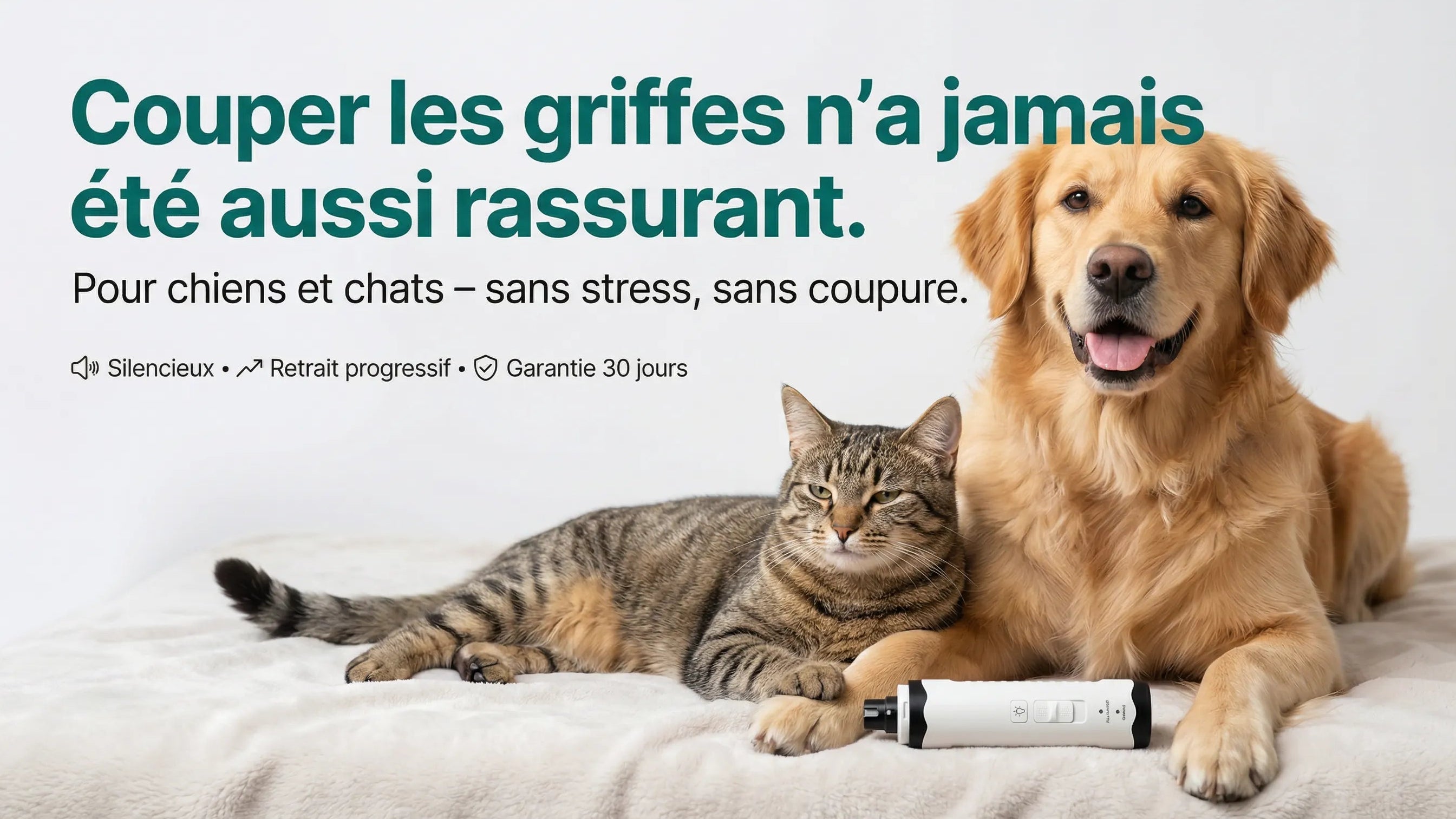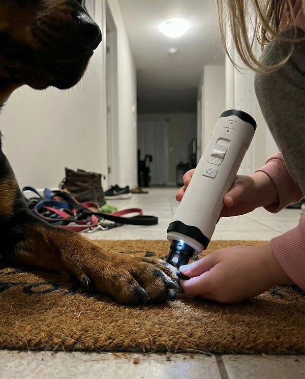 Sécurité : capot/embout de protection (plusieurs tailles selon l’animal) pour guider la griffe et limiter les “dérapages”.